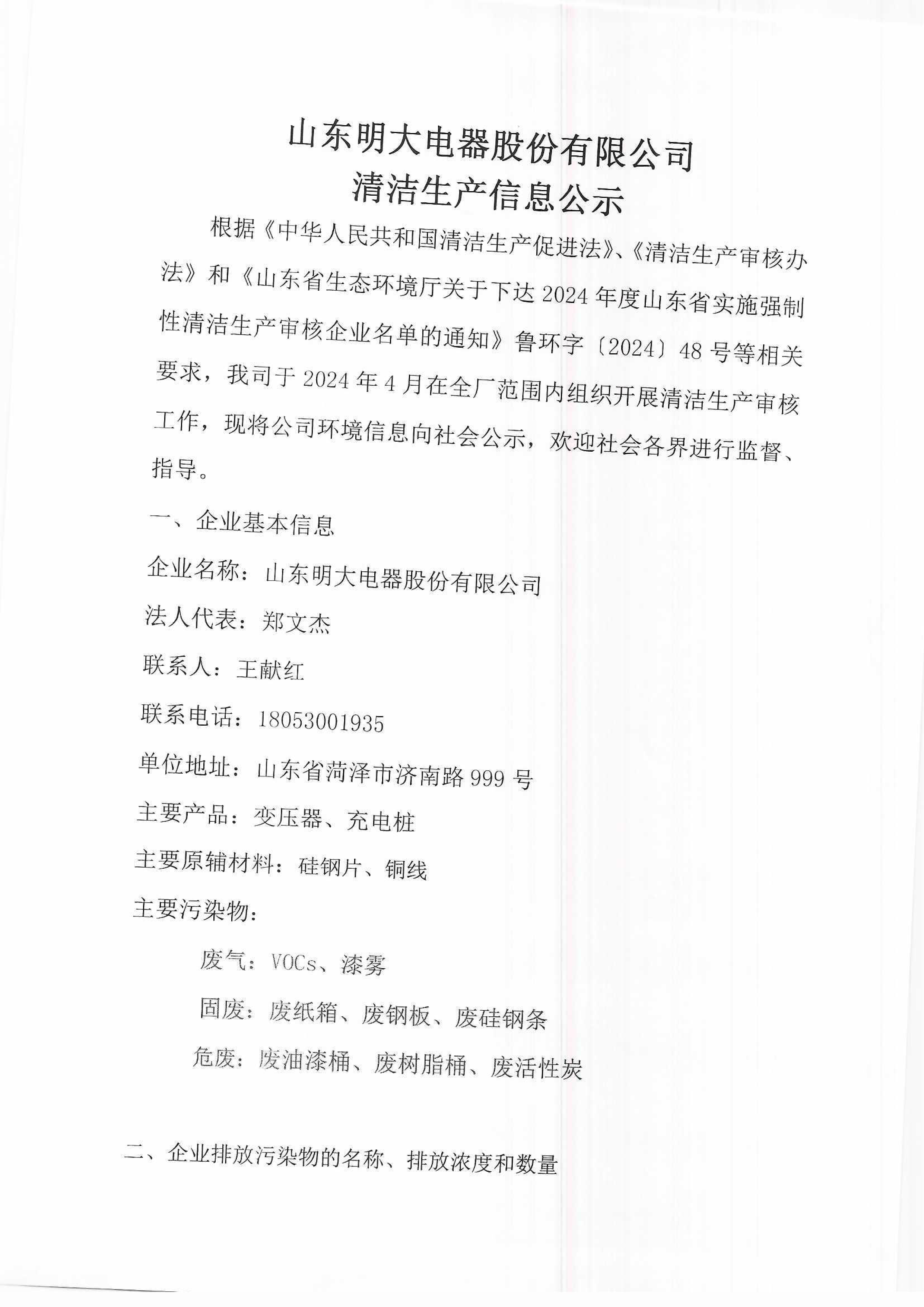 明大電器清潔生產(chǎn)信息公示